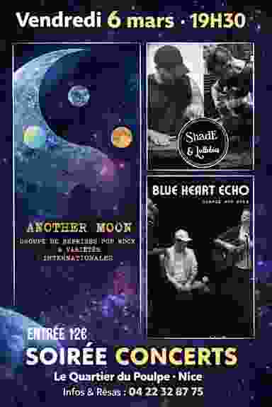 Trois concerts live d’exception s’enchaînent le temps d’une soirée intense. À 19h45, Shade & Lullabies ouvre la scène avec ses compositions pop rock en clair-obscur. À 21h, Blue Heart Echo t’emmène dans son univers pop folk. Puis, de 22h à minuit, 4Another Moon fait vibrer la salle avec sa sensibilité pop rock portée par Franck, Laurent, Rico et Vera. Une nuit, trois ambiances, zéro temps mort.