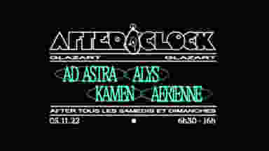 After O'Clock est de retour ce samedi 5 novembre au petit matin ! 🥵🔥 On vous donne rendez-vous de 6h30 à 16h dans le club indoor de Glazart à Porte de La Villette. Rendez-vous pour un nouveau plateau techno qui donne chaud avec Ad Astra, Aérienne, Alys & Kamen ! __________________________ 🎫 TICKET Préventes : 9,50 € Sur place : 9,50€ 𝗚𝗥𝗔𝗧𝗨𝗜𝗧 à partir de 12h __________________________ ⏰ AFTER O'CLOCK Au menu de ton petit déj : 🍊 Line up techno survitaminé 🔊 Soundsystem full DnB 🌟 Show light ⛩ 3 terrasses en extérieur 🤫 Des surprises aléatoires avec performances et activités. ______________________ 🦺 VESTIAIRE Prix par article : 2€ Capacité limitée, venez léger ! Pas de valise, plan vigipirate. ______________________ 🚧 ACCÈS L'événement est réservé à un public de + de 18 ans. Une carte d'identité vous sera demandée à l'entrée. La direction se réserve le droit d’admission. 7-15 Avenue de la Porte de la Villette 75019 PARIS M(7) : Porte de la Villette ______________________ 🚗 Notre partenaire VTC FREENOW vous propose 2x10€ offerts pour venir mais aussi pour rentrer avec le code GLAZART, à entrer dans l'app Lien vers l'app : https://mytaxi.onelink.me/HySP/ef3572c9 ______________________ 🕰 HORAIRES D'OUVERTURE Afters tous les samedis, dimanches & veilles de jours fériés de 6h30 à 16h. _____________________ Licence 2 : R-20-0010014 Licence 3 : R-20-0010015 ______________________ Glazart www.glazart.com facebook.com/Glazartparis instagram.com/glazartparis Visuel : https://www.instagram.com/adntm_/