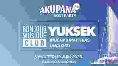 🌞 Vendredi 19 Juin 2026 🕒 19:30-23:00 ~ Départ depuis le Port d'Arcachon uniquement ⛵ Embarquez pour une expérience visuelle et auditive avec un coucher de soleil sur le plus gros catamaran du Bassin d'Arcachon ! ▬▬▬▬▬▬▬▬▬ AU PROGRAMME ▬▬▬▬▬▬▬▬▬ 🌊 AKUPANA et le collectif BONJOUR MUSIQUE CLUB invitent YUKSEK, MUCHAS MATTHIAS et UNCLØSD pour une Boat Party dont vous vous souviendrez ! 19h15 - Contrôle de vos billets 19h30 - Embarquement à bord du bateau LE CÔTE D'ARGENT - Départ pour une navigation au coucher de soleil sur le Bassin d'Arcachon 19h45 - Lancement des artistes 23h00 - Le Capitaine prend le chemin du retour Le débarquement se fera entre 23h et 23h30 au Port d'Arcachon. 👋🏼 Buvette et Snacking à bord ▬▬▬▬▬▬▬▬▬ INFOS PRATIQUES ▬▬▬▬▬▬▬▬▬ Accès : 🚲 Petit port d'Arcachon, Rue des Marins 33120 ARCACHON 🚋 Gare SNCF d'Arcachon + Bus BAIA ~ Ligne 7 Arrêt : Boulevard de la Plage + 3 minutes à pied 🚤 Venez depuis le Cap Ferret / Nord Bassin avec la Navette U.B.A. de 17h30 ou 18h30 (+8€), débarquez à la Jetée Thiers d'Arcachon + 10 minutes à pied pour nous rejoindre / Nous pourrons vous débarquer à la Jetée Bélisaire à 23h00 sans frais supplémentaire Conditions : 🎟️ Accès à l'évènement muni d'un billet uniquement. 🥂 Tables & Accès VIP en supplément sur réservation par mail : akupanafestival@gmail.com 🍱 Réservez nos plateaux de nourriture Premium pour le meilleur service le jour J : akupanafestival@gmail.com Tenue correcte exigée. Accès interdit aux mineurs. Aucun acte raciste, homophobe, transphobe ne sera toléré au sein du bateau. Aucun comportement visant à troubler la faisabilité de l'évènement et la tranquillité des passagers ne sera toléré, même si vous détenez un billet. Toute nourriture ou boisson ne pourra être introduite à bord. Pour des questions de sécurité, il est interdit d'entrer dans le bateau avec des bagages, sacs à dos ou sacs à main. Nous tolérons les sacs à main dans un format A4 maximum (21x30x10 cm). Toute personne montant à bord est informée qu'il sera réalisé un reportage photographique et vidéo de l'évènement, par votre présence, vous consentez une exposition devant les objectifs et la réalisation de clichés sur lesquels vous apparaîtrez.