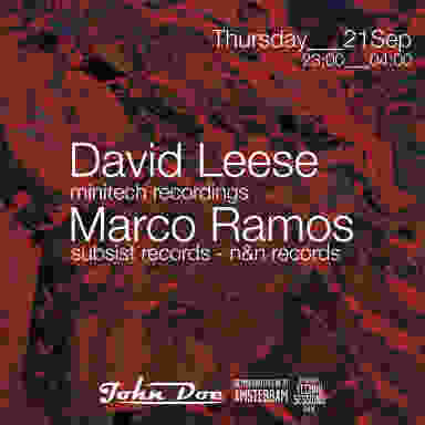 Amsterdam Techno Sessions is a weekly Techno event, held every Thursday, in Amsterdam. Every week, local and international artists are invited to showcase their work and personal definitions of Techno. This Thursday, 21st of September 2023, we are back to John Doe for our weekly Techno instalment. And for this one, we invited a really well-known face in the Amsterdam Techno scene, David Leese, to headline the night. Followed by our resident DJ, Marco Ramos. Join us at John Doe from 23:00 until 04:00 on a powerful and intimate Techno night. Tickets are now available. DAVID LEESE David Leese is an Amsterdam-based DJ, who is well known for his fresh, diverse DJ sets and enthusiastic performances. With many years of experience, David knows how to play the crowd with his refined choice of techno music. His move to the capital of The Netherlands at the beginning of 2012 gave his career a real boost. He became a resident at the Beatroom events and played at many clubs and festivals such as Paradiso, Melkweg, Air, Studio 80, Sugar Factory, Ruigoord, Mystic Garden Festival and Loveland Festival. In the last couple of years, he also got the chance to visit some new countries. Some of the highlights were Arsenal Fest in Serbia, Groove on the Grass in Dubai, YinYang Music Festival on the Great Wall of China and a tour to India. Since May 2017 David is part of 50:Hertz, a techno platform with a weekly, globally broadcasted radio show that also facilitates events, masterclasses and panels during Dancefair and Amsterdam Dance Event. Moreover, in the spring of 2019 50:Hertz started its own experience-driven concept called Orbis. In the summer of 2019, David got his first release out on Minitech Recordings, another milestone for this experienced artist. Marco Ramos is a Portuguese bohemian DJ/producer, art, music and nightlife lover, based in Amsterdam, The Netherlands. His excellent mixing technique and musical sensibility, allow him to easily adapt to the reality of the dance floors, leaving at the same time its own trademark. His distinctive mixing style and eclectic sets make him a very versatile DJ mixing from techno to electro. Whenever he is around one thing is always guaranteed, the party is ON! As a DJ he played in key clubs and music festivals in Portugal, Spain, Netherlands and Germany as Nature One Festival, Kadoc, Cais Ao Rio, Attika Disco, Domus, Indústria, Lenox Club, Sugar Factory, Reset Club, The Crane Faralda Hotel, Tropics, Bumpers, Coimbra Dance Event and shared the stage with international artists as Alexi Delano, A.Paul, Ben Long, Billy Dalessandro, Billy Nasty, Carl Craig, DJ Emerson, DJ Ze Mig-L, Industrialyzer, Frank Kvitta, Gary Beck, Jeff Mills, Mark Flash, Misc., Rebekah, Ritzi Lee, Submerge, Vince Watson, Torsten Kanzler, The Advent and live acts as Da Weasel, Terrakota, Kussondulola, Blasted Mechanism among many others... After his first release on Subsist Records, he´s currently busy working on his own productions and collaborating with several Amsterdam techno movements.