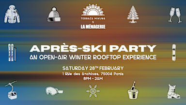 APRÈS-SKI ROOFTOP PARTY — THIRD EDITION For its third edition, the Après-Ski Rooftop Party takes over the rooftop once again with an open-air alpine night above Paris. DJs, winter energy, warm plaids, food, hot wine and cocktails set the tone on a fully heated rooftop, with panoramic views over Paris and the Eiffel Tower. Tables with food & bottle service available Reservations: +33 6 30 46 28 33 Saturday, February 28th 8:00 PM – 2:00 AM 7th floor, 1 Rue des Archives, 75004 Paris Open-air rooftop under the winter sky Dress code: Après-Ski — Moonboots, ski suits, faux fur, knitwear Limited capacity _______________________ SOIRÉE ROOFTOP APRÈS-SKI — TROISIÈME ÉDITION Pour sa troisième édition, la soirée Après-Ski Rooftop revient prendre place sur les hauteurs de Paris pour une nuit alpine à ciel ouvert. DJs, énergie hivernale, plaids bien chauds, food, vin chaud et cocktails rythment la soirée sur un rooftop entièrement chauffé, avec une vue panoramique sur Paris et la Tour Eiffel. Tables avec service food & bouteilles disponibles Réservations : +33 6 30 46 28 33 Samedi 28 février 20h – 2h 7ème étage, 1 rue des Archives, 75004 Paris Rooftop à ciel ouvert sous le ciel d’hiver Dress code : Après-Ski — Moonboots, combinaisons de ski, fausse fourrure, grosses mailles Places limitées
