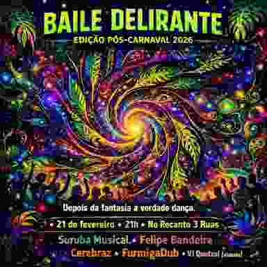 BAILE DELIRANTE – EDIÇÃO PÓS-CARNAVAL Um baile para quem sobreviveu ao carnaval. Para quem trabalhou no carnaval. Para quem fugiu do carnaval. E para quem ainda não quer que ele acabe. Essa é a transfiguração final. Sai o glitter comercial. Entra o delírio tropical psicodélico político-poético. Pra quem ainda está digerindo o fim da festa mais popular do nosso continente, a gente oferece a fórmula básica que sempre deu certo: músicas diferetonas, sensoriais, experimentais — para conhecer melhor esse mundão que habitamos. Valorizando nossas raízes. Misturando cultura popular com batidas psicodélicas de raízes digitais. Colocando o Nordeste em diálogo com o mundo. E sim — é baile de esquerdista mesmo. Com tiradas contra o conservadorismo engessado, contra a normatividade que não representa a nossa realidade diversa, vibrante e viva. ✨ Convidado especial: Cerebraz Músico, cantor, compositor e produtor musical. Chega trazendo sua poesia psicodélica para nos lembrar da pergunta essencial: o que é ser humanx? E entre uma pista e outra, seguimos discutindo — porque pensamento também dança. No som: DJ Felipe Bandeira Com seu repertório eclético dentro da música eletrônica, costurando atmosferas e pulsos. Suruba Musical Nossa jam-session delirante, com musicxs convidados improvisando ao vivo sobre as bases do residente furmigoso. FurmigaDub Além das bases, faz pocket show com suas composições e remixes, fruto de uma pesquisa em world music centrada na cultura popular nordestina e suas conexões com ritmos do mundo. E nas projeções: Quetzal Visuais Nossa rainha da psicodelia visual. VJ residente, projetando universos astrais e dimensões paralelas na pista. O Recanto 3 Ruas, o lugar mais vibe da cidade atualmente, abraçou esse delírio com gosto e coragem. Enquanto houver espaço para experimentar, questionar e dançar — a gente não sai de lá. Onde? Recanto 3 Ruas Quando? Sabado as 21 horas dia 21 de Fevereiro de 2026 Quem? FurmigaDub, CereBraz, VJ Quetzal Visuais, DJ Felipe Bandeira, Suruba Musical