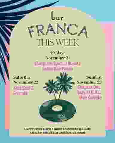 This Weekend at Bar Franca: Fri Nov 21: Secret Guest, Sebastian Posso Sat Nov 22: Xica Soul & Friends Sun Nov 23: Chapter One Records: Hazy, HUDL, Max Coletto It’s a full week of programming at Bar Franca paradise, running Friday through Sunday. Swing by our intimate sound room for craft cocktails, delicate melodies, and some serious fun. 21+ No Cover 8PM-2AM Happy Hour 8-9PM