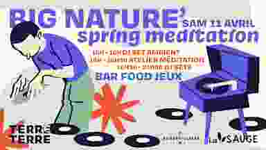 Bienvenue au BigNature’s Spring Meditation! Le collectif UK queer majoritaire s’installe à Terre Terre le Samedi 11/04, et nous vous proposons une journée de meditation, reflection, et joie pour marquer la tournée vers le printemps. BigNature invite Kelsey Carson pour faire un atelier ambient méditatif avec notre fondateur ALF, qui est sûr de vous permettre de recentrer avec vous-meme en se lançant vers le printemps. Kelsey, Inspirée du zen, à la découverte de la sagesse ancestrale dans la vie moderne, nous fera un atelier de Méditation: une respiration consciente guidée qui va nous inviter à faire la transition des saisons et respirer ensemble le printemps. Ensuite, rencontrez la nouvelle aile Parisienne du collectif au fur des DJ set joyeux, éclectique et rythmé. 🎶 Horaires : 15:00 : Ouverture des portes 🚪 15:00-16:00 : DJ set Ambient 🎧 16:00-16:30 : Atelier de Meditation 🧘 16:30-19:00 : CAL B2B ALF 19:00-20:30 : Bibli 20:30-21:30 : Big Angel 23:00 : Fermeture des portes ✨ •••••••••••••••••••••••••••••••••••••• 🌸 Terre Terre en vue !🌸 Terre Terre est la 3ème ferme urbaine créée par l'association la SAUGE ! Située au niveau du pont de Landy à Aubervilliers, cette ferme urbaine de 3000 m2, co-construite par les habitant.es et les acteur.rices du territoire a vu le jour début 2020. Terre Terre est un lieu de production agricole participatif, où l'on vient s'exercer à la pratique du jardinage ou simplement flâner au milieu des espaces de culture. 🌱 La SAUGE 🌱 La SAUGE est une association qui depuis 2015 agit pour réaliser sa mission : faire jardiner le plus de monde possible 2h par semaine de manière respectueuse du vivant. Elle crée des fermes urbaines, des jardins partagés, des programmes pédagogiques, cultive des plantes et graines et organise des événements culturels pour tous et toutes. 📍 ACCÉDER À TERRE TERRE Terre Terre • Quai François Mitterrand (sous le pont du Landy), Aubervilliers. 🕧 Horaires : Jeudi-Vendredi (17h-22h) • Samedi (10h-23h) 🚇 Accès : Métro 12 (Mairie d’Aubervilliers) • RER B (La Plaine Stade de France) • Bus 45, 173, 35, 239, 150. 🚲 Vélo : 10 min depuis La Villette (Parking sur place).