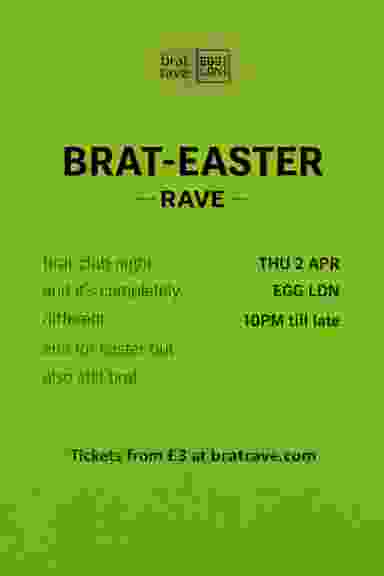Brat-easter Rave at EGG LDN THU 2 APR | 10PM till late Brat returns with an Easter twist. After sell out parties across the UK, we’re taking over EGG LDN for a night that’s completely different and for Easter but still brat. No gimmicks. No clichés. Just chaos on the dancefloor. Expect Charli XCX bangers, pop anthems, hyperpop chaos and brat classics running through EGG’s multi room space until late. This is Easter done properly. Loud. Dramatic. Unhinged. What to expect Charli XCX, Rina Sawayama, Ashnikko, Marina, Kim Petras and more Brat performers bringing energy to the dancefloor Confetti and immersive lighting Full EGG sound system experience Dress code encouraged: brat green, red or elevated chaos London’s ultimate Easter rave. Tickets from £3 available at bratrave.com EGG LDN, 200 York Way, London N7 9AX Nearest stations: Caledonian Road, Holloway Road, King’s Cross Important: This event is 18+. Valid ID required. Entry must be before the time stated on your ticket. Management reserve the right to refuse entry in line with licensing law.