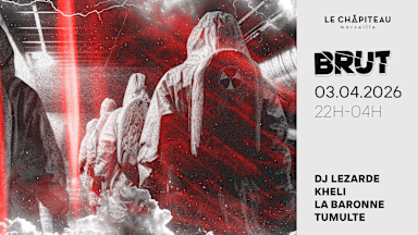 ♬ 🔊 ♬ 🔊 ► BRUT ► TECHNO & UNDERGROUND ► 22h00 – 04h00 ► Pur sound system 13 KW / Multidiff / Traitement acoustique ► BAR – BIO, LOCAL et à petits prix ► Restauration tapas ► ENTRÉE GRATUITE AVANT 00h !! (sur réservation) ♬ 🔊 ♬ 🔊 BRUT, c’est la matière brute du dancefloor. Des kicks tendus ET des basses qui roulent sans concession. Ici, on ne caresse pas le tempo — on l’affronte. C’est une nuit pour celles et ceux qui aiment quand la techno transpire, quand le groove devient martèlement, quand le corps prend le relais du cerveau. Line-up calibré pour la pression. Pas là pour décorer. Sans détour. Sans compromis. BRUT. — LINE UP — KHELI LA BARONNE DJ LEZARDE TUMULTE ------- ⏰ TIMING 22h : Début des DJ sets 4h : Fermeture des portes 🌅💔 ------- 🍭 BILLETTERIE : GRATUIT AVANT 00H : Sur réservation NORMAL : 5€ + frais de loc LATE : 10€ + frais de loc SUR PLACE : 12€ ------- 💛 On prend soin les un·es des autres 💛 ➡ La musique s'arrête à 03h45 et on évite le bruit en quittant les lieux pour ne pas déranger les voisin·es : on vous attend donc on fire dès la première heure ! ➡ Tout comportement oppressif est banni du Chapiteau. On se réserve le droit de refuser toute personne ayant des comportements oppressifs et/ou discriminatoires. ➡ L'équipe se tient à votre disposition si vous subissez quelconque type d'agression / harcèlement ou vous sentez mal à l'aise vis-à-vis du comportement d'un·e personne. ➡ En achetant un billet, vous acceptez que des images de la soirée soient publiées sur les réseaux sociaux, dans des aftermovies ou albums photos. ☮ PEACE, LOVE & MUSIC !! Dans le respect, dans la joie, dans la musique !! --- INFOS PRATIQUES --- ► BAR - BIO, LOCAL et à petits prix à Marseille ► Accès : 38, Traverse Notre Dame de Bon Secours, 13003, Marseille Vélo : Station Vélib n°3320 à quelques mètres, Place Cadenas Bus : 31/32 arrêt “Place Caffo” | 33/34 arrêt “Belle de Mai Loubon” | 49 arrêt “Bernard Clovis Hugues” | 72 arrêt ‘’Plombières Notre Dame de Bon Secours"