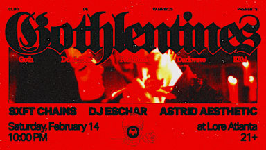 The coldness of your undead lover's hand in yours, the smell of wilting roses brushing against your face... Ah yes, love is in the air once again at Club de Vampiros, and we're celebrating from the bottom of our black little hearts with our yearly Gothlentines event at Lore Atlanta! 🖤 Guest DJ Sxft Chains will be starting the evening with a goth DJ set that will bring the flesh of any two lovers closer together on the dance floor. Sputnik's very own DJ Eschar will then take over with a deathrock and post-punk set that will rattle your bones back to life. Our resident DJ Astrid Aesthetic will then conclude the night with a darkwave and EBM set that will satisfy your lust... and your bloodlust. Our Vampire Vixens will once again be leading the night with gogo and exotic dancing, and vendors Cowgirl Corpse, Mushroom Farts, and Persona Arcana return to help you find that special something for the love of your death. Lore's bartenders will also be serving beer, wine, and cocktail and mocktail specials deep into the dark hours of the night. And we'll have an exclusive cocktail on the menu that will only be available for this special event, so make sure to arrive thirsty, vamps! 🩸 $12 Secret Admission (which you can find the code to unlock on our Instagram) and $15 General Admission tickets are now on sale, but grab yours quickly because these are bound to sell fast! See you on Saturday, February 14th! 🥀 Club de Vampiros presents… Gothlentines with Sxft Chains, DJ Eschar, and Astrid Aesthetic Saturday, February 14th 10:00PM Ages 21+ Lore 466 Edgewood Ave SE Suite B Atlanta, GA 30312 ⚫️ Posters designed by design.byjad 🟣 Tickets sold by Shotgun 🟡 Proudly sponsored by Topo Chico