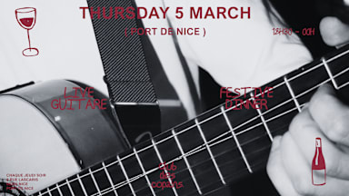 CLUB DES COPAINS 🍷 SHOW GUITARE LIVE 🎸 THURSDAY 5 MARCH - Le Club des Copains se réunit chaque jeudi soir au Port de Nice. Dès 18h30, on se retrouve entre locaux pour un aperitivo. À partir de 20h, le bar se transforme en restaurant de partage : menu unique 39€ / pers, lumières à la bougie, musique live de quartier. Tapas faits avec amour, belles bouteilles ouvertes, grandes tables et belles rencontres. Venez picorer chez votre voisin et partager le moment, le temps d’une soirée. Team Club des Copains - 18H - 20H APÉRITIVO 20H - 22H30 MENU DES COPAINS & DJ SHOW LIVE 🎸 ENTRE COPAINS 🍽️ ( Réservation Obligatoire ) 22H30 - 00H AFTER DES COPAINS WITH COCKTAILS - INFORMATIONS Every Thursday From 18:00 to 00:00 Club des copains For more information, please contact: +33.7.68.94.00.48 Olivia team des copains