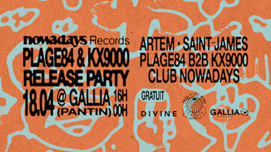 RELEASE PARTY PLAGE84 & KX9000: 9084° @ Gallia On vous donne rendez-vous au Bar Gallia à Pantin pour fêter la sortie du nouvel EP 9084° de Plage84 & KX9000 véritable terrain de jeu hybride à la croisée de la House, du R&B et du Jazz électronique. Au programme: Plage 84 B2B KX9000 ARTEM Saint-James Club Nowadays 🔈Focus Line up 🔈 Plage84 B2B KX9000 Née d'une alchimie immédiate lors d'un plateau commun en 2022, la collaboration entre KX9000 et Plage 84 s'est cristallisée lors de nombreuses sessions au sein du studio Villette 45 à Aubervilliers. D'un côté, KX9000, producteur évoluant grâce à de nombreuses releases (Ponf Neuf Records, theBasementDiscos, LYAM) au background jazz-funk ; de l'autre, Plage 84 et son sens du groove experimental slalomant entre les genres sur tous ses derniers singles (Roche Musique, Nowadays Records, 84SOL) >> https://www.instagram.com/plage84/ >> https://soundcloud.com/plage84 >> https://open.spotify.com/intl-fr/album/18XdC9LT3fxdCWuxRhAHyd?si=rE426JwBSDGoS3ofNZ1YNw >> https://www.instagram.com/kx9000/ >> https://soundcloud.com/kx9000 ARTEM Basée à Paris, ARTEM tisse des ponts entre scènes underground, de Séoul et Hong Kong à New York. À la croisée de ses racines serbes et de l’énergie percussive de Lisbonne, elle construit des sets physiques et rythmiques entre basses profondes, percussions rapides et musiques de club. Reconnue pour sa technique et ses blends audacieux, elle s’est produite aux Ardentes, Solidays ou Yardland, et partage aussi sa vision via la curation et la radio (Kiosk, Reprezent, Bruzz), avec une résidence “Balkan Core” sur Rinse France. >> https://www.instagram.com/artemskz/ >> https://soundcloud.com/artemskz Saint-James DJ et producteur, Saint-James navigue avec aisance entre jazz, disco et musiques électroniques. Influencé par le britfunk, il est à l’origine des compilations In The Red sur Chuwanaga, label qu’il co-dirige. Actif sur la scène via des projets comme Discomatin ou Easter Sounds Festival, il développe aujourd’hui le duo Margot et Max (French boogie / eighties) et le projet house Milk & Honey avec Tour-Maubourg. Il a sorti des titres sur La Mamie’s, D.KO, Chuwanaga et plusieurs autres labels français. >> https://www.instagram.com/saint_james.dj >> https://soundcloud.com/saint-james >> https://open.spotify.com/intl-fr/artist/1X5nimB3dDNsyoed4FzH3n?si=Ltb7PO3GTxq0uEjj4lISXQ CLUB NOWADAYS Depuis plus de 11 ans, Nowadays Records anime la scène électronique française. Plus qu’un label, c’est une famille musicale qui célèbre chaque sortie et chaque rencontre. Avec Club Nowadays, ses compilations et ses soirées taillées pour le dancefloor, le collectif fédère un public toujours plus large. >> https://www.instagram.com/nowadaysrecords/ >> https://on.soundcloud.com/It5mFSEpB2S5ZWR38M Et comme d’habitude, toujours : 🍻Un large choix de bières Lager, IPA, Nepa, Sour, Stout, Vières et de softs artisanaux ⛱️Une terrasse qui fait plaisir 🏠Une Halle pour s'abriter si besoin, ou pour jouer au babyfoot ou au flipper, ou pour faire une graaaaande tablée de copainEs ~~~~~~𝗟𝗲𝘀 𝗶𝗻𝗳𝗼𝘀 𝘂𝘁𝗶𝗹𝗲𝘀~~~~~~ 35 rue Méhul, 93500 PANTIN Metro 5 Eglise de Pantin Horaires : 12h – 00h Entrée Gratuite, comme d'habitude