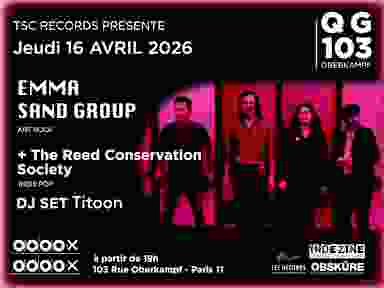 TSC RECORDS & INDEZINE RADIO LIBERTAIRE PRÉSENTENT 🖤EMMA SAND GROUP🖤 (PARIS ART ROCK) EMMA SAND GROUP : Emma Sand Group mêle les sonorités rêches d'un rock élégant à des influences americana soutenues par la puissance vocale, la sensibilité d'une interprète habitée, guerrière, fragile. Le groupe invite l'audience au voyage : des atmosphères troubles et hypnotiques, des ballades folks aux accents rock et blues, aux couleurs de road movies poétiques et décalés. 🖤https://www.facebook.com/EmmaSandBand 🖤https://www.youtube.com/@emmasandgroup 🖤https://www.instagram.com/emma_sand_group 🖤https://emmasand.bandcamp.com/ 🖤The Reed Conservation Society🖤 (PARIS INDIE POP) THE REED CONSERVATION SOCIETY « La société de préservation du roseau » (02/02/2024 – Violette Records / Kuroneko) – Les orfèvres pop Stéphane Auzenet et Mathieu Blanc passent au français après trois EP anglophones. Avec le renfort entre autres de Yann Arnaud aux manettes et de l’étoile filante Natacha Tertone (sur La nage indienne et Le mont de piété), TRCS signe un premier album toujours marqué par une patte mélodique des plus habiles, et un goût pour les somptueux arrangements. Comme l’annonce la pochette de Sophie Lécuyer, la nature et l’eau sont omniprésents sur ce disque, s’inspirant de la peinture (Petit coefficient, Aux rochers rouges…), imaginant des histoires d’amour dans un monde en plein chaos (superbe premier single Pylônes), à distance (Le tamis, autre single de grande classe), parfois dramatiques sans jamais tomber dans le glauque (À cœur joie), invente une ‘murder ballad’ en VF (Molly), un blues foutraque (Saint-Elme dans le désert), et même une échappée vers l’aventure à travers un poste de radio (Laïka). Première classe, ça sonne pas mal non plus en français. 🖤https://www.facebook.com/TRCSfrenchband 🖤https://thereedconservationsociety.bandcamp.com 🖤https://www.instagram.com/the_reed_conservation_society/ DJ Mythique Made in Gibus Paris 🖤Dj Titoon🖤 en mode New Wave Party https://www.facebook.com/profile.php?id=100040886215067 Ouverture des portes : 19h HAPPY HOUR: La pinte à 5€ !!! Aucune discrimination, remarque sexiste ou homophobe n'est tolérée lors de nos événements. En cas d'incident, merci d'en informer immédiatement notre équipe. Les membres TSC Records et les gestionnaires du lieu se réservent le droit d’entrée.