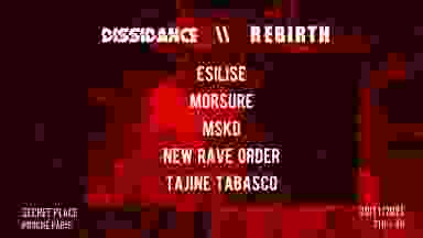 💫 Un jour, une origine, une renaissance... 💫 Plus d'un an s'est écoulé depuis que la Dissidance s'est fait entendre au rythme des kicks et des basses dans un lieu utopique... Plus d'un an que ses membres se sont réunis afin de célébrer les valeurs qui nous sont chères, durant une nuit de liberté... En dehors des codes, loin des normes, tu as décidé de devenir un.e dissident.e. Car la Dissidance est un, la Dissidance est tout. _____________________________ 🎶 LINE UP 🎶 𝔢𝔰𝔦𝔩𝔦𝔰𝔢 - Hard techno, Acid, Indus FB : https://www.facebook.com/esilise SC : https://soundcloud.com/esilllise MORSURE - DUSK Records / Falsive Records / Sindex - Indus, Hard techno FB : https://www.facebook.com/morsuremusic/ SC : https://soundcloud.com/morsureofc MSKD (Hybrid live)- Diligences records / Union Trance Mission / MSKD records - Industrial techno, Acid, Rave FB : https://www.facebook.com/MSKD13/ SC : https://soundcloud.com/ms-kd New Rave Order – Dissidance / The Finest Techno - Acid techno, hard techno, hard trance, Indus FB : https://www.facebook.com/NROnewraveorder/ SC : https://soundcloud.com/newraveorder Tajine Tabasco - Dissidance / Sindex - Hard trance, Hard dance, Acid FB : https://www.facebook.com/tajinetabasco/ SC : https://soundcloud.com/tajine-tabasco _____________________________ 🎫 BILLETTERIE 🎫 TARIFS : Dissi-early (entrée avant 23h) : 13€ (+0,99€ de frais de loc.) Dissi-late (entrée après 23h): 18€ (+0,99€ de frais de loc.) ➡️ https://shotgun.live/fr/events/dissidance-reborn _____________________________ 🍺 BAR 🍺 Alcool personnel non autorisé. Bar à prix doux sur place. Happy Hour de 21h à 23h. _____________________________ 📍 LIEU 📍 L'adresse du lieu sera communiquée uniquement aux détenteurs de prévente le jour de l'évènement. Nous vous demandons de respecter le lieu. _____________________________ ℹ️ INFORMATIONS ℹ️ Fin des entrées à 1h30. Pass sanitaire (avec QR code) obligatoire : - Vaccination complète - ou Test PCR/antigénique négatif de moins de 72h - ou Test PCR/antigénique positif de plus de 11 jours et moins de 6 mois. Événement interdit aux mineurs. Tout comportement inapproprié (violence, racisme, harcèlement, dégradation du lieu...) fera l'objet d'une exclusion définitive de tous nos événements.