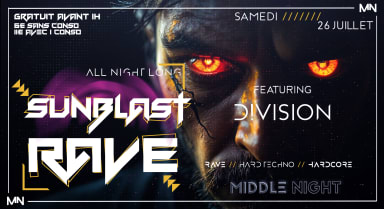 🎉 Samedi 26 Juillet — D!VISION - Sunblast Rave À partir du 4 juillet, le club passe en 100% Hard Techno & Hard Music tous les vendredis et samedis. 🎵D!VISION : Dj et producteur clermontois aux influences hard techno , Hardcore et Bass Music , D!VISION incarne l’avant-garde par son audace à briser les genres avec puissance et précision en mélangeant ses différents univers de prédilection pour vous faire groover toute la nuit sur de grosses lignes de basses 🎵 Rave - Hard Techno -Hardcore ⏰ Entrée gratuite pour tous jusqu'à 1h 💸 Tarifs après 1h : 🎫 Entrée simple : 6€ 🍹 Entrée + 1 conso : 11€ 🍸 Entrée + 2 consos : 18€ 🍾 Entrée + 3 consos : 25€ 📍 Middle Night — 12-14 Rue Ramond, 63000 Clermont-Ferrand 🕒 Ouverture : 23h45 – 06h00 🔊 Middle Night devient le nouveau QG des amateurs de BPM extrêmes.