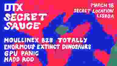 Secret Sauce is all about hidden ingredients or unexpected combinations. And to start it off, a special b2b between Moullinex and Totally Enormous Extinct Dinosaurs in on the menu, with support by DTX artists GPU Panic and Madd Rod.