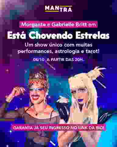 ✨ Prepare-se para “Está Chovendo Estrelas”, uma noite cósmica única! ✨ Morgante, a drag cigana, e Gabrielle Britt te guiam numa jornada cheia de humor, previsões astrológicas e sinastrias amorosas! 🔮💫 🔹 Descubra o que os astros reservam para você! 🔹 Divirta-se, interaja e teste seu conhecimento no quiz astrológico! 🌟 Uma chance imperdível de explorar os signos e o amor com muita diversão! 📅 Não perca essa experiência! 🔮 Garanta seu ingresso no link da bio e brilhe com a gente!