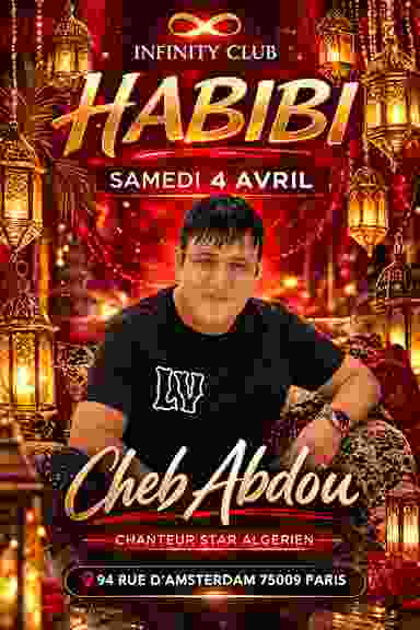 ÉVÉNEMENT HABIBI SPECIAL CHEB ABDOU SAMEDI 4 AVRIL 2026 de 23H00 à 05H30 La star internationale algérienne CHEB ABDOU pour un showcase exclusif. KENNY BOY vous prépare un mix paradisiaque ! 🎤 Show live exclusif – Cheb Abdou 🥂 Tables & espaces VIP disponibles 🎶 Sélection musicale raffinée : oriental, raï & club 🪧 INFOS La direction se réserve le droit d'entrée. 🖇️ Instagram : @soiree_la_habibi 👻 Snapchat : soireehabibi24 Adresse : 📍 Infinity Club 94 rue d’Amsterdam, 75009 Paris ➡️ Accès métro : Ligne 2 ou Ligne 13 – Station Place de Clichy