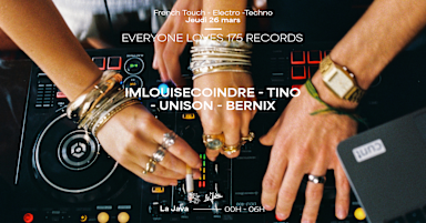 175 records présente “Everyone loves 175 records” Ta nouvelle soirée préférée où on se retrouve pour danser toute la nuit, partager la musique et créer des moments iconiques au rythme de plusieurs styles musicaux. 175 mélange House, Electro, French Touch et Techno avec une seule ambition : rassembler tout le monde pour former qu’une seule et même bande de potes le temps d’une nuit. If everyone loves 175, i’m sure you will love it too! Come early, stay late! 𝗟𝗶𝗻𝗲 𝘂𝗽 🔈 : IMLOUISECOINDRE : @imlouisecoindre https://www.instagram.com/imlouisecoindre/ TINO : @val.chb https://www.instagram.com/val.chb/ UNISON : @unisonmusique featuring @ad_boeda @cykalexis https://www.instagram.com/unison_musique/ https://www.instagram.com/ad_boeda/ https://www.instagram.com/cykalexis/ BERNIX : @bernix_____ https://www.instagram.com/bernix____/ ❤️ La Java se veut être un lieu inclusif, accueillant toutes les communautés. Aucune forme de sexisme, racisme, homophobie, transphobie, persécution ou harcèlement au sein du club ne sera tolérée. Nous nous réservons le droit de refuser l’entrée ou d’exclure toute personne ne respectant pas nos valeurs afin de préserver notre public ! 🔞 Établissement interdit aux mineurs (contrôle d'identité avec pièce originale valide). - 𝗥𝗘𝗦𝗘𝗥𝗩𝗔𝗧𝗜𝗢𝗡 : SMS / Whatsapp : 06 14 16 73 57 Mail : communication@la-java.fr - 𝗙𝗢𝗟𝗟𝗢𝗪 𝗨𝗦 : Instagram : https://www.instagram.com/lajavabelleville/​ Facebook : https://www.facebook.com/lajavabelleville​
