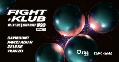 🫧🧼 Fight Klub #23 🧼🫧 Le Fight Klub s’aventure cette fois-ci dans l’Est de la France, et pour cette grande première à Nancy, c’est l’Ostra qui nous ouvre ses portes. Pour marquer l’événement, nous mettons à l’honneur un artiste 100% local : Zeleke, résident du Fight Klub depuis un an et membre actif de la Zintrie. À ses côtés, vous retrouverez Daymount, le boss de Panchama Fight Klub, ainsi que nos résidents parisiens 7Ranzo et Fawzi Adjan. Entre Tech House, Minimal, Electro, Progressive House et Techno, attendez-vous à un voyage sonore intense. Nous sommes impatients de partager notre vibe avec vous amis Nancéiens ! _______________ Sound system powered by Funktion-One 23h55-7h Shotgun 10€ & fee Sur place 10€ CB ou Cash Vestiaire 1€ par article