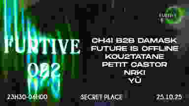🐍 Furtive 022 🐍 Plus d'information sur notre Instagram @furtiveparis Le 25 octobre, nous revenons avec une nouvelle édition placée sous le signe du mystère 🐍 Un line-up taillée pour les âmes les plus téméraires et une secret place soigneusement choisie pour vous plonger dans l’univers unique de Furtive. ⭕ Préparez-vous à une nuit intense, immersive et imprévisible. 👀 🎟 Places limitées – premier arrivé, premier servi. ⭕ Restez dans l’ombre, restez furtifs. Êtes-vous prêts à écrire ce nouveau chapitre toujours plus furtif ? 🥷⭕️ ⭕⭕⭕⭕⭕⭕⭕⭕⭕⭕⭕⭕⭕⭕⭕ ✨🤍 SAVE THE DATE : Samedi 25 octobre 2025 🕖 23H30 - 6h00 ⭕️- LINE UP - ⭕️ NRKI FUTURE IS OFFLINE KOU2TATANE CH4I B2B DAMASK PETIT CASTOR YU ⭕⭕⭕⭕⭕⭕⭕⭕⭕⭕⭕⭕⭕⭕⭕ — INFOS PRATIQUES — 😀 Coin chill 🍻 Bar prix doux ⭐ Stand Passe aller peace ⭕⭕⭕⭕⭕⭕⭕⭕⭕⭕⭕⭕⭕⭕ Le collectif se réserve le droit d’entrée dans l’établissement. 🔞 Évènement interdit aux mineurs. 🚫 NO GHB/GBL (expulsion immédiate) 🫶 Merci de respecter le lieu et ses alentours. ❗️— CONSENTEMENT & TOLÉRANCE —❗️ sont le fondement de nos soirées. ❗️Tout acte de violence et/ou comportement non approprié engendrera une exclusion définitive de nos événements. ⭕⭕⭕⭕⭕⭕⭕⭕⭕⭕⭕⭕⭕⭕⭕ — TICKETS — ( Quantité limitée ) ✖️COMPLICE FURTIF 🥷💫 - 10€ ✖️REGULAR FURTIF ⚡️💥- 15€ L’accès à l’événement est réservé aux personnes étant en mesure de présenter un billet valide. ⭕⭕⭕⭕⭕⭕⭕⭕⭕⭕⭕⭕⭕ ⚠️ Un contrôle d’identité sera mis en place à l’entrée pour des raisons de sécurité. Le collectif se réserve le droit d’entrée dans l’établissement. 🔞 Évènement interdit aux mineurs. 🚫 NO GHB/GBL (expulsion immédiate) 🫶 Merci de respecter le lieu et ses alentours. Un billet est considéré comme une participation aux frais et est réservé aux membres de l'association 767 records