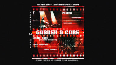 Rendez-vous ce vendredi 14 Mars pour la soirée Gabber & Core. Au programme 4 heures de sets où se rencontreront les genres early hardcore, early terror, frappecore et frenchcore. Préparez vos meilleures chaussures et venez taper du pied au rythme frénétiques des BPM ! -- INFOS -- - Lieu T'es Rock Coco, 16 rue Beaurepaire, Angers - Horaires : 21h45-01h45 - Bar sur place - Vestiaire sur place, et casier à partir de 2€ Toutes formes de discriminations ou de comportement inapproprié entraînera une exclusion et un bannissement à vie de nos événements. -- LINE-UP -- Panora_ :