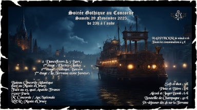 Samedi 29 Novembre 2025 de 23H à l'aube ★★★2 Dance Floors, 3 étages et 3 bars : ★★★ ➥1er étage : Gothique, Batcave, Post Punk : (Guest Djs :Alexis Lyncelia & Addams) ➥2nd étage : Électro –Indus : DJ Laurent https://www.facebook.com/laurent.djgparis ➥ Terrasse fumeur ► INVITEZ VOS AMIS GOTHS A L ÉVÉNEMENT ▬▬▬ INFOS PRATIQUES ▬▬▬ Happy Hour de minuit à 1h Petit déjeuner Vestiaire sur place -Prévente =coupe-file ➥ Lors de cette soirée, si vous avez manqué de temps pour vous préparer, n'ayez crainte ! Vous pourrez aussi vous faire maquiller par le talentueux Damned ! Stand présent sur la terrasse ! Insta : @the_nhormes BATEAU CONCORDE ATLANTIQUE face au musée d'Orsay 23 quai Anatole France 75007 Paris Métro Concorde ou Ass. Nationale RER musée d'Orsay