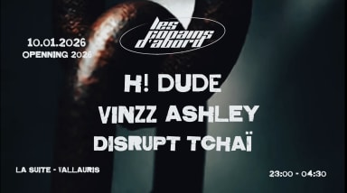 ⚡ OPENNING 2026 – H! DUDE ⚡ Les Copains d'abord sont de retours ! 🔥 On reprend ensemble les bonnes habitudes avec l'openning de cette nouvelle année 2026 en compagnie du duo producteur/artiste H! DUDE. Fondateurs de la Technostep, H! DUDE vous promet un show hors du commun ! Ils sont bouillants, nous aussi, on attend plus que vous 🫵 🎟 PLACES LIMITÉES – Openning 2026 à ne surtout pas manquer ! Restez connectés et suivez-nous sur les réseaux sociaux pour ne rien manquer de nos prochains événements et surprises. From les Copains d'Abord with ❤️ ---------- Infos pratiques ---------- 🗓 10/01/2026 🕚 Horaires : 23h - 4h30 🎟 à partir de 13,99€ 📍 2121 Chem de St. Bernard 06220 Vallauris 🎟️ Billetterie : - Super Early : 14,99 € - Early : 16,99 € - Regular : 19,99 € - Last : 22 € - Sur place : 25€ 🎶Line Up : - DISRUPT TCHAI - VINZZ - H! DUDE - ASHLEY Sonorised by PMP