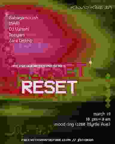 @hyefrequencies presents: RESET Join us on March 19th at Mood Ring to celebrate Spring Equinox and the start of a new year, as commemorated by Nowruz, Kha b’Nissan, and other ancestral traditions from the SWANA region. Let’s celebrate the end of a dark, cold winter as we reset into the season of light, growth, and new beginnings. Lineup: Babagamoush (@_babagamoush_) MARI (@elinaarbo) DJ Vahshi (@audreypeshkam) Teeyam (@baba_pishi) Zara Dekho (@zaradekh0) Flyer by @______.k.___._ ੈ✩‧₊˚ੈ✩‧₊˚ $10 cover or free before 11 PM with RSVP on Resident Advisor Cash, card, and Apple Pay accepted for door payments. Tickets are non-refundable. *Information for "Free before 11 PM with RSVP" ticket holders: You must arrive and get checked in at the door before midnight to redeem this entry special. We recommend arriving early to avoid a line. @moodringnyc