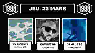 PREVENTE 6€, SUR PLACE 8€ / ACCÈS AUX 3 SALLES / 00:30 - 06:00 ▸ Planet : CAMPUS 88 HIP HOP by DJ Hustler ▸ Salon : 88 SOCIETY ▸ Club : CAMPUS 88 TECHNO by Blacksand INFOS PRATIQUES : Pièce d’identité obligatoire / +18 ans La Direction se réserve le droit d’entrée. Aucun remboursement effectué en cas d’alcoolisation excessive ou de comportement violent. Vestiaire Obligatoire 2€ (3€ Sac) Conso à prix réduit avant 2h
