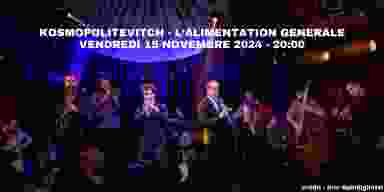 KOSMOPOLITEVITCH / L'ALIMENTATION GENERALE vendredi 15 novembre — 20:00 Kosmopolitevitch est un projet musical qui vit et évolue depuis sa création en 2013 comme une cartographie sonore, retraçant les trajectoires des musiciens qui la portent. Issus de la scène jazz, des musiques du monde, ainsi que des orchestres symphoniques à travers l’Europe (de Paris à Athènes en passant par Berlin), ils transmettent une fois sur scène la fougue et la richesse des paysages culturels des Balkans. Le mélange de leurs parcours et les influences qui les nourrissent donnent lieu à une expérience musicale qui leur est propre, où les sons de la clarinette, de la trompette, du oud, et des percussions traditionnelles transportent le public des montagnes serbes, aux campagnes roumaines, en passant par le répertoire des îles grecques et des côtes d’Asie Mineure. Au fil des années, les musiciens de Kosmopolitevitch ont construit une maison commune et l'ont meublée d'un vaste héritage de chants et d'airs de différentes traditions. Ce concert vous invite à la visiter, en chantant, en courant, et en dansant ! Ange Sierakowski, clarinette Nicolas Arsenijevic, saxophone Noé Nillni, trompette Salvatore Conticello, chant, luth, trompette Anthony Caillet, euphonium Marco Pascucci, trombone Lucca Alcock, contrebasse, Félix Leclerc, percussions → 20h-23h → Entrée : 5€ prévente / 8€ sur place ▬▬▬▬▬▬▬▬▬▬▬▬▬▬▬▬▬▬▬▬▬▬▬▬▬▬▬ INFOS PRATIQUES ▬▬▬▬▬▬▬▬▬▬▬▬▬▬▬▬▬▬▬▬▬▬▬▬▬▬▬ L'ALIMENTATION GÉNÉRALE → Adresse : 64 Rue Jean-Pierre Timbaud, 75011 Paris Métro Oberkampf (L5) / Parmentier (L3)
