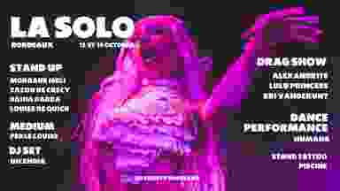 VENDREDI 13 et SAMEDI 14 OCTOBRE : LA SOLO IS BACK AVEC UNE SOIRÉE DE FOLIE ET UNE PROGRAMMATION 100% FÉMININE AU SOCIETY Alice Kieffer revient avec son concept inédit : se donner le challenge de venir vivre seul.e cette expérience (tu peux venir accompagné.e of course) Une programmation inédite proposée le vendredi et rejouée le samedi soir pour que tu n'aies plus d'excuse pour rater cette soirée de folie ! 18H00 Ouverture des portes 19H00 SHOW MEDIUM avec Perle Louise 20H00 STAND UP avec Morgane Meli - Zazou de Crecy - Bahia Dadda - LouisedeQuick 21H00 DRAG SHOW avec Alexandrite - Lulu Princess - Bri Vandekunt 22H00 DANCE PERFORMANCE avec Human's 23H00 - 02H DJ SET avec Incendia Le maxi + de cette édition : LA PISCINE INTÉRIEURE ! Alors prenez vos maillots ! Une soirée résolument féministe et festive tournée self confidence, provoc et good vibes comme seule LA SOLO sait le faire avec pour objectif de valoriser les femmes. + tout au long de la soirée vous pourrez vous faire tatouer par @_nyx.tattoo @tuft-ink.tattoo @sodiumchloride_tattoo Piscine ouverte à partir de 23H00 Soirée accessible à tous.tes DA : Alice Kieffer - MC : Morgane Meli