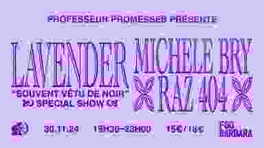 LAVENDER Lavender est un jeune artiste, multi-instrumentiste, chanteur et producteur parisien. Depuis son premier album My Soul is not for sale sorti en 2020, Lavender ne fait qu'affûter son style, et continue à représenter ce qu'il appelle le ROCK808. Nouveau genre que l'artiste entend bien imposer, le ROCK808 s'imprègne de l'énergie et de la puissance de la Trap (notamment de ses basses 808), pour les jumeler avec celles du Rock et notamment du Punk. Cette concentration explosive transcende LANVENDER sur scène et son public le suit. RAZ 404 Raz 404 est l'alias DJ du streamer Raz. Il aime mélanger les univers musicaux, du rap aux musiques club, des morceaux les plus populaires aux musiques les plus pointues. Sur Twitch, à la Pride, dans les clubs, il aime surtout performer, et cela, dans les espaces les plus divers possibles. MICHELE BRY La musique de Michele s'inscrit dans une indie pop lo-fi rappelant celle des années 90, portée par des boucles de guitare et des mélodies ear-worm. Artiste visuelle et musicienne, elle est influencée notamment par la twee pop, l'IDM, ou toutes formes d'archives sonores et visuelles.