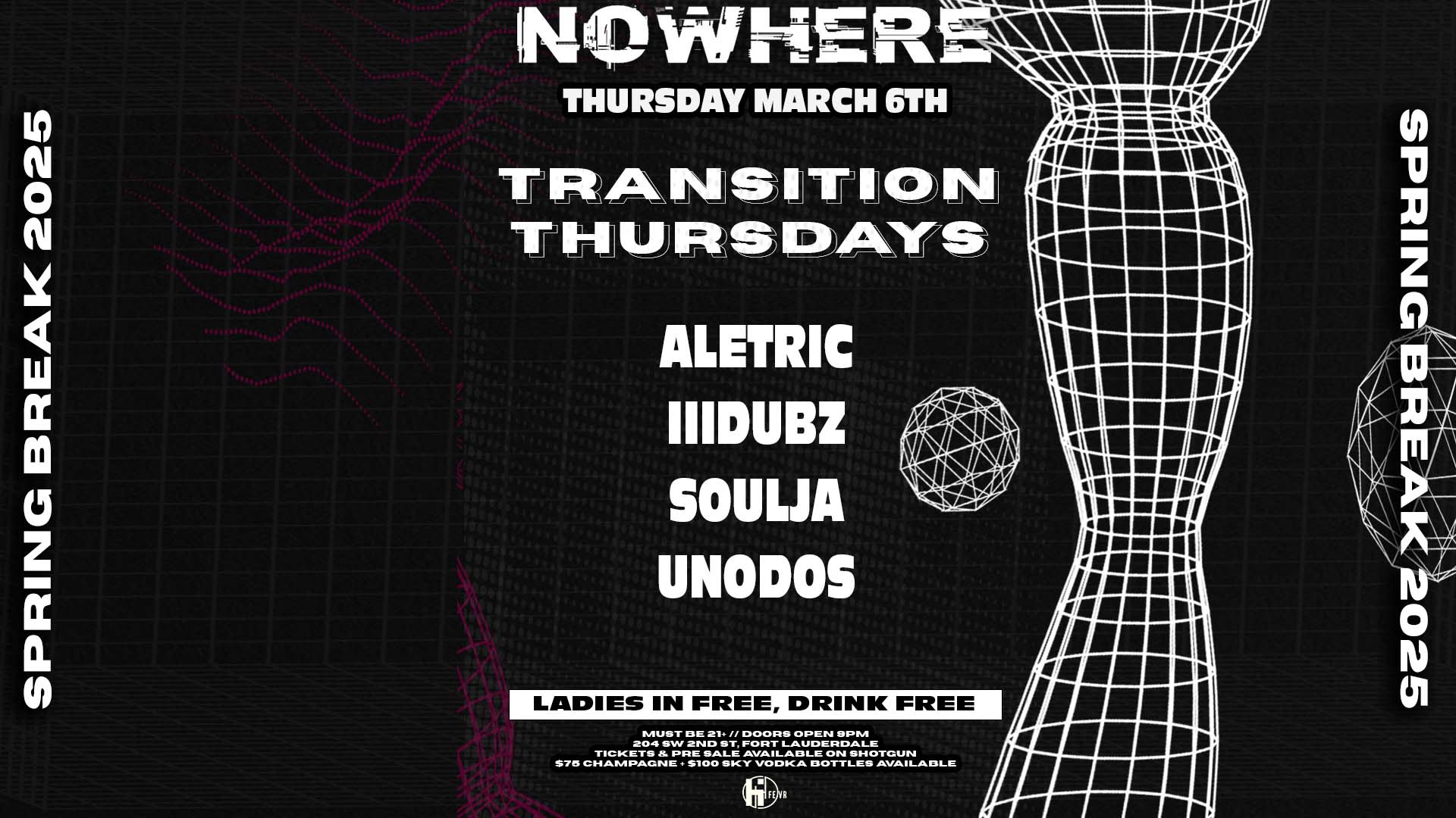 Throughout the duration of Spring Break 2025, Nowhere Lounge will present every Thursday this event featuring guest and local talent from a wide range of US colleges. It's time we turn the heat up in here! Experience a night full of energy as we go on a journey from an open format music perspective into the realm of House Music.
