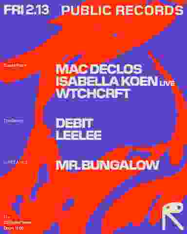 Paris-based producer and DJ Mac Declos is known for his masterful blend of intense, precise, and technical techno. Drawing on a deep understanding of groove from his professional dance background, Declos’s sets create an unparalleled connection between body and beat. Isabella Koen performs live. The sound artist, researcher, and composer investigates the intersections of sound art and club music, best known for her hard-driving, all-hardware live sets and off-kilter releases rooted in the dissection and experimentation of classic rave, hard techno, trance, and drum 'n' bass. WTFCRFT, who also DJs as one half of Madness Of with KYRUH, wields a new, acid-tinged, high-octane take on house and techno, solidifying his name among the new order of Black dance music producers in Brooklyn. In The Atrium, Debit and leelee: Mexico-born, New York-based Debit recontextualizes experimental electronics into a tapestry of Latin club that is both high-concept and high-impact. Her cross-cultural club innovations fuse techno and bass with guaracha, tribal, raptor house, and Brazilian funk. A Harlem native and now debuting at 233 by way of LA, leelee's multimedia approach to Black, queer, and femme artistry has paved the way for their community. She is the host of NTS' Rave Reparations and continues to use balanced-yet-chaotic sonics to explore her own intersectionality. Mr.Bungalow brings his hi-fi ear and deep grooves to the lounge UPSTAIRS. - Public Records aims to provide a safer space. We reject all forms of discrimination, including racism, misogyny, transphobia, homophobia, sexism, and other aggressive behavior. Consent is paramount. Please exist with respect for yourself and those around you. Anyone found in violation of our rules or safer space policy will be removed from the venue. To share feedback about an incident, please email hello@publicrecords.nyc or alert a member of our team. Tickets may be available at the door based on capacity. A ticket does not guarantee entry; admission into the venue, including UPSTAIRS, is subject to the discretion of our staff. All large bags + coats must be checked. Doors close at 3 AM.