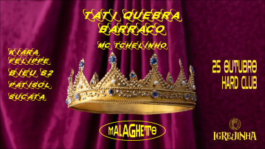 MALAGHETTO EDIÇÃO #4 Com TATI QUEBRA BARRACO & MC TCHELINHO 25 DE OUTUBRO Local: Hard Club Porto Horário: 23H59 às 06H00 Line: KIARA FELIPPE BIEU S2 SUCATA PATISOL Parceria com Buteco Igrejinha