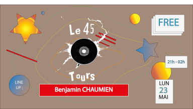 Tous les lundis le 45 Tours invite des djs indépendants à venir se produire en Dj set et à vous envoyer leurs meilleurs pépites! Et ce Lundi soir nous acceuillons Benjamin pour un set full vinyle all night long. ----------- LINE UP ------------- 🎧 Benjamin CHAUMIEN SC: https://soundcloud.com/benjamin-chaumien ---------- INFOS PRATIQUES ----------- Entrée gratuite Le 45 Tours - Bar / Restaurant / Miniclub 45 Rue de Montreuil 75011 Paris Infos/ Réservations: 09 54 89 42 32 tours45@gmail.com https://www.le45tours.fr Métro : Ⓜ⑧ : Faidherbe-Chaligny Ⓜ⑨ : Rue des Boulets Ⓜ①, ⑥, RERⒶ : Nation