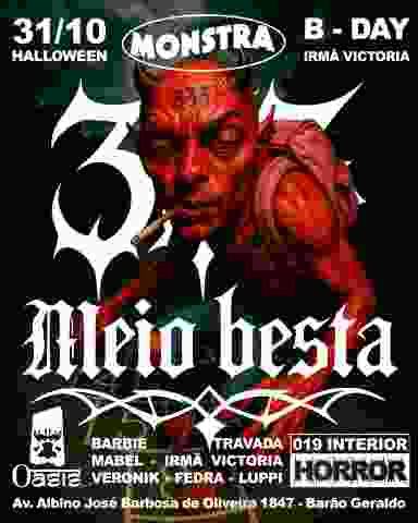 🎃 GOSTOSURAS OU TRAVAS DURAS? 😈 Dia 31 de Outubro a Festa Monstra estaciona sua vassoura no Oásis Barão 🧹 👻 para mais uma edição - 333 Meio Besta 🤪🤩 y pra melhora vamos celebrar o aniverio de Irmã Victoria que é bruxa de carteirinha e faz aniversário no dia do Saci 🧙‍♀️🎂💖 Cola com a gente que além de um line Up recheado de magia com Barbi Travada, Veronik, Mabel & a Dona da noite Irmã Victoria (a melhor) se acha que para porá aí? Nananinanão contamos com Fedra y Luppi na performance 🎭 👹 PREPARA SUA FANTASIA Y VEM DANÇA! 💃 🪩