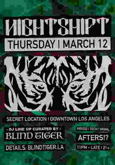 DTLA's premier after-hours speakeasy seven nights a week. MNML | TECH | HOUSE 21+ Entrance through the alley FREE RSVP only valid until 1am No flash photos or videos RIDESHARE RECOMMENDED Didn’t get the address? DM @Nightshift.LA on Instagram or text ADDRESS to our hotline at +1 (844) 943-2647 Come early, stay late.