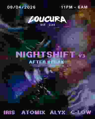 Nightshift V3 It's that time again.... We're back on the 8th of April for a night full of house, trance, ukg & dance music. 11 pm - 6 am Loucura, Pink Street Lineup: IRIS SEERY C-LOW ALYX ATOMIX