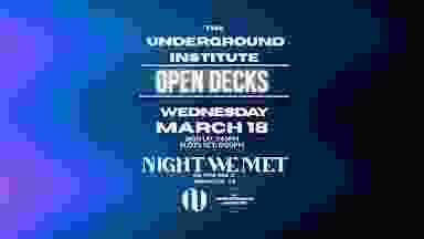 VIP TABLES Text: (833) 368-6916 Email: tables@nightwemet.com This is a 21+ event. Entry is permitted with proper ID only. Refunds: All tickets are final sale and cannot be exchanged or refunded.are available only if the event is rescheduled or cancelled Parking: We have FREE PARKING at 1200 Broadway. All you need to do is validate your parking at the Box Office or Bar and you'll receive a sticker for your ticket. This is only valid for the lower deck (whole foods lot). Vera Lounge opens at 8pm. THE UNDERGROUND INSTITUTE RULES: 1. ALL PARTICIPANTS MUST BRING THEIR OWN USB 2. EACH PARTICIPANT WILL GET A 20 MINUTE SET 3. SETS WILL BE GIVEN ON A FIRST COME, FIRST SERVE BASIS. WE WILL OPEN THE DOORS AT 8PM AND THE SIGN-UP WINDOW WILL END AT 8:30PM OR WHEN SLOTS ARE MAXED OUT. FIRST DJ STARTS AT 8:30PM 4. THIS IS A PLACE TO SHOWCASE YOUR SKILLS NOT LEARN HOW TO DJ 5. HAVE BASIC UNDERSTANDING OF PIONEER GEAR 6. GEAR: [2] PIONEER CDJ 3000S, PIONEER A9 MIXER General Questions Email info@nightwemet.com