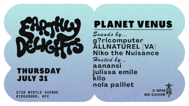 planet venus is a sentimental day-to-night party curated in the spirit of nightlife before cell phones. it embodies the full spectrum of pleasure seekers, artists, masters of gossip, and those who love to move. come through to make art, mingle, and dance side by side with fellow lesbians of color to house and ghettotech from day thru nite. art supplies will be provided by us and sounds provided by curator g?rlcomputer, the incredible DJ ALLNATUREL all the way from the VA and BX native on the decks Niko the Nuisance. this event is open 2 the public and free but we encourage folks to donate to Living Lesbian Archive to support the spirit of Black lesbian community and art.