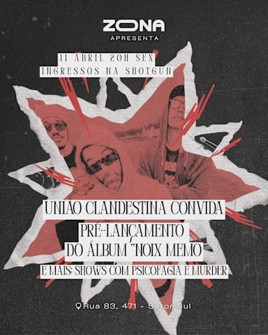 🔥 PRÉ-LANÇAMENTO DO ÁLBUM “NOIX MEMO” 🔥 A União Clandestina convida geral para a festa de pré-lançamento do seu primeiro álbum de estúdio, “Noix Memo”, agora no ZONA PUB 🔥 A noite reúne três forças do rock pesado goiano: ⚡ União Clandestina – rap rock com riffs pesados e letras sobre o cotidiano e questões sociais. 🌀 Psicofagia – rock pesadélico que mistura punk, stoner e psicodelia. 💀 Murder – peso do metal, hardcore, rap e percussão afro-brasileira. Uma noite de peso, atitude e música autoral no underground goiano. 🎤 Depois dos shows: KARAÔKE ATÉ ÀS 02:00 📍 ZONA PUB – Rua 83, nº 471 – Setor Sul 🎸 União Clandestina | Psicofagia | Murder 🎟️ INGRESSOS VIA SHOTGUN