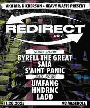 @akaMRdickerson and Heavy Waste are back at Good Room to bring you a pre-Thanksgiving workout! Good Room: Known for high energy bliss and unexpected turns, Saia kickstarts the night. S'aint Panic continues the vibe, known for their genre blending and groovy energy, the Carry Nation resident is not one to miss. Bringing us home, Byrell The Great closes the night. Having made a name for himself as one of the top ballroom DJs, with works like the Vogue Workout series, you know it’s going to be impossible to leave. Bad Room: Umfang plays the peak slot in Bad Room, bringing her distinct approach. Her amorphous polyrhythmic soundscapes, layered with deep cut selections, plays with people’s expectations of how a techno set can be defined. Ladd, warms up the room. The Conference Call founder brings a sophistical palette of tight grooves and deep rhythms. Heavy Waste co-founder and resident HNDRNC closes the room out. For him, techno is the language of processing reality, an unfiltered expression of self, delivering an empowering, dark, and masterful experience. $15 in advance. $20 at the door. Redirect is a music first creation, curated and designed to create a space for all to come together, learn from each other, and share. We have a zero tolerance policy for violence, non-consensual touching, racist, homophobic, transphobic, sexist, ageist, or other discriminatory language. Those failing to respect that will be ejected immediately.