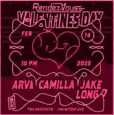 Feb 14 Saturday 10pm-Late Rendezvous go to TBA Brooklyn. Featuring some of the finest locals in NY. a-z Arvi Camilla Jake Longo Hope to see everyone there 🫶