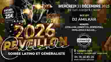 Mercredi 31 Décembre 2025 Réveillon Caliente – Soirée latino et généraliste SOIREE LATINO & GENERALISTE – 25€ De 22h jusqu’à l’aube (Inclus ENTREE + VESTIAIRE) Latino, mérengué, reggeaton, bachata, kizomba, groove, Brazil, salsa, kuduro, clubbing, afro… DJ Amilkar Minuit : Cotillons, confettis, serpentins, papillotes & bulles… ► INFOS & RÉSERVATIONS : Cabana Café : 30 rue de l’Annonciade 69001 Lyon 04 78 28 85 26 https://www.cabana-cafe.com/ https://www.facebook.com/Cabanacafelyon https://www.instagram.com/cabanacafelyon/ Info accès facile pour venir à Cabana : ¤ En métro : lignes A et C arrêt Hôtel de ville Louis Pradel puis prendre le bus ou 3 min à pied. ¤ En bus : C13, C18, S6 et S12 arrêt Mairie du 1er arrondissement. ¤ En voiture : – Parking gratuit du jardin des Chartreux au bout de la rue de l’Annonciade (5mn à pied). – Parking payant de la Croix Rousse ou Hôtel de ville puis 8 min à pied.