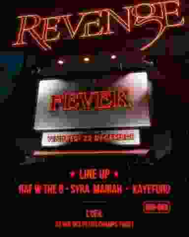 Ce vendredi 22, Revenge est de retour pour une édition Spéciale, aka « FEVER » ACCEPTEZ VOUS D’ÊTRE SOUS FIÈVRE 🥵 AVEC CE LINE UP : RAF W. The 6 KAYEFURU SYRA MARIAH "L'OEIL" STRIVES TO BE A SAFE SPACE. DISRESPECT WILL NOT BE ACCEPTED. MISOGYNY. RACISM, HOMOPHOBIA AND ALL OTHER FORMS OF HATE WILL NOT BE TOLERATE AND WE RESERVE THE RIGHT TO REFUSE ENTRY AT THE GATE.