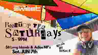 Come in for our Saturday Rooftop-T featuring different DJ's every Saturday from 5pm to 9pm. Join us Jun 7th for Sweet's own DJ Ken-E spinning his awesome beats for you! And to make Saturday even more delicious, enjoy our $5 off Burger special all day from our kitchen. At the bar we have $10 pitchers of Bud Light until 10pm, our famous Booozy Slushes on our rooftop! So, get out of the heat and onto our rooftop where our misting system will keep your summer cool! 21+ NO COVER, Free Parking! (first 4 rows along the building) Something SWEET for everyone!