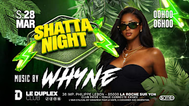 SAM 28 MARS – SHATTA NIGHT 🟢🔥 La soirée 100% shatta avec Whyne aux commande du Duplex Club 💥 Une ambiance afro tropicale toute la nuit 🎧 Aux platines : Whyne Shatta - Urban - Open format ℹ️ Infos pratiques : ⏰ Ouverture : 00h00 – 06h00 🧥 Vestiaire : 2€ 🎟 Free Pass dispo sur Shotgun.fr valable avant 0h30 🎟 Entrée classique : 5€ sans conso / 10€ avec conso 🚌 Navette gratuite depuis La Roche jusqu’à 10km 👔 Tenue correcte exigée – Club privé 📍 36 impasse Philippe Lebon – 85000 La Roche-sur-Yon