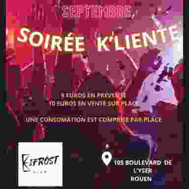 La "Soirée k'LIENTE au BIFRÖST Club" est présentée par le BDE kINE "La RouKine' au BIFRÖST CLUB Jeudi 05 Septembre de 23h à 6h ! La SOIREE K'LIENTE va être LA soirée à ne pas manquer. Préparez-vous à une soirée mêlant divers styles musicaux créant une ambiance exaltante et dynamique. Rejoignez-nous pour une soirée inoubliable au BIFRÖST CLUB, et immergez-vous dans l'atmosphère captivante de notre DJ TISKAZ. Venez vivre une expérience exceptionnelle au BIFRÖST CLUB ! 🌟 Tarif Prévente : 8€ = Entrée prioritaire Club + 1 CONSO. Tarif sur place : 10€ = Entrée Club + 1 CONSO. Vestiaire à disposition de 2 à 4€ Espace "fumeurs" intérieur Lieu : BIFRÖST CLUB 105, Bld de l'Yser 76000 ROUEN Métro & Bus T4 : Arrêt Beauvoisine Infos & Réservations : 0612754028 A Jeudi ! Soirée ouverte à TOUS !!!!
