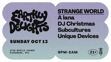 Strange World is a vinyl-centric party celebrating the experimental, leftfield, and unapologetically queer edges of dance music. A Lana is a Brooklyn house deejay with a deep passion for disco dancing breaks. She is the co-founder of the party series Carouse and a resident deejay for the Flux party at Bossa Nova Civic Club. Her record collection goes deep, and every set is approached with care and intent to tell the stories of house through the message in the music. DJ Christmas is a DJ about whom nothing is known. Now let us listen to the music. Subcultures pulls from his ever-expanding record collection to explore the emotionally evocative and immersive sides of dance music. His playful style veers between cerebral melodies, electro-futuristic textures and rhythmic delirium, with an ear towards sounds both silly and affecting. He hosts Gravitation, a bi-weekly journey through celestial grooves on Newtown Radio, and co-founded Community Hole, a party series for messy queens. Unique Devices is the moniker of Wesley Bryon (she/her), a producer and DJ out of Brooklyn, NY.