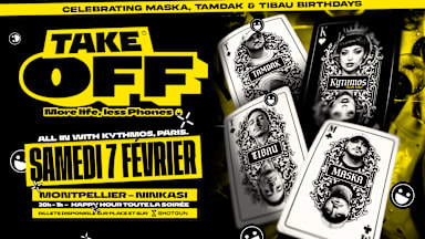 ♠️ TAKE OFF 4 - 7 FÉV 2026 ♠️ @ninkasimontpellier À peine atterri que l’on vous propose de repartir ensemble pour un nouveau vol ! Nous accueillerons @kythmos directement venu de Paris ainsi que notre crew Take Off. 🥤 PROGRAMME : UK Garage, Trap, Drum & Bass, Jersey, Urban, Baile.. Une sélection sans frontières, pensée pour vous, portée par des artistes qui aiment mélanger les styles et les énergies. Avec une Happy Hour toute la soirée ! 🎯 LINE-UP 20h-21h : Warm Up 21h-22h : @maskaaaahhh 22h-23h : @tibau._ 23h-00h : @kythmos 00h-1h : @tamdak ♠️ FOCUS GUEST — @kythmos Figure montante de la scène club alternative, Kythmos développe des sets hybrides et percussifs, entre bass music, club, trap et rythmes global club. Londres, Ibiza, Paris, Milan ou encore Malte, Kythmos est passée par des clubs et collectifs de référence et sollicitée pour des projets culturels et lifestyle (Off White, Sony Music…), elle impose une énergie puissante et fédératrice, parfait pour ce prochain événement. 👨🏼‍✈️ Un big birthday À l’occasion des 3 anniversaires des membres du crew Take Off espacé de quelques jours, nous profiterons pour fêter cette nouvelle année qui commence pour nous, on achètes un gros gateau et plein de bougies ? @tamdak tu t’occupes du remix Happy Birthday en trap ? ℹ️ INFOS PRATIQUES 🗓 Samedi 7 février · 20h → 01h00 📍 Ninkasi Montpellier — Tram Ligne 3 (arrêt Pablo Picasso) 🍺 Happy Hour toute la soirée 🥇 Bières artisanales multi-médaillées