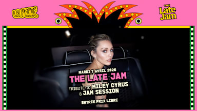 THE LATE JAM - tribute to Miley Cyrus The Late Jam débarque dans les pentes ! On commence par un concert à 20h (45min) suivi d’une jam Sur place il y a : Batterie / Micro / Guitare / Piano / Basse 📍 LA PENTE : 14 montée des Carmélites, 69001 LYON 📆 Mardi 7 Avril 2026 ⏰ 20h - 00h 🎫 Entrée prix libre ❤️ BAR ANTI RELOU 🖕 Nos événements sont des espaces de liberté, d'égalité et de bonheur, c'est pourquoi les actions ou comportements suivants ne sont pas tolérés : racisme, sexisme, transphobie, homophobie, misogynie, discriminations, intolérances, ainsi que l’irrespect des règles de consentement